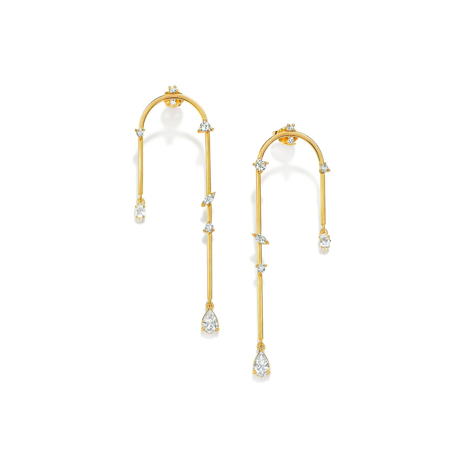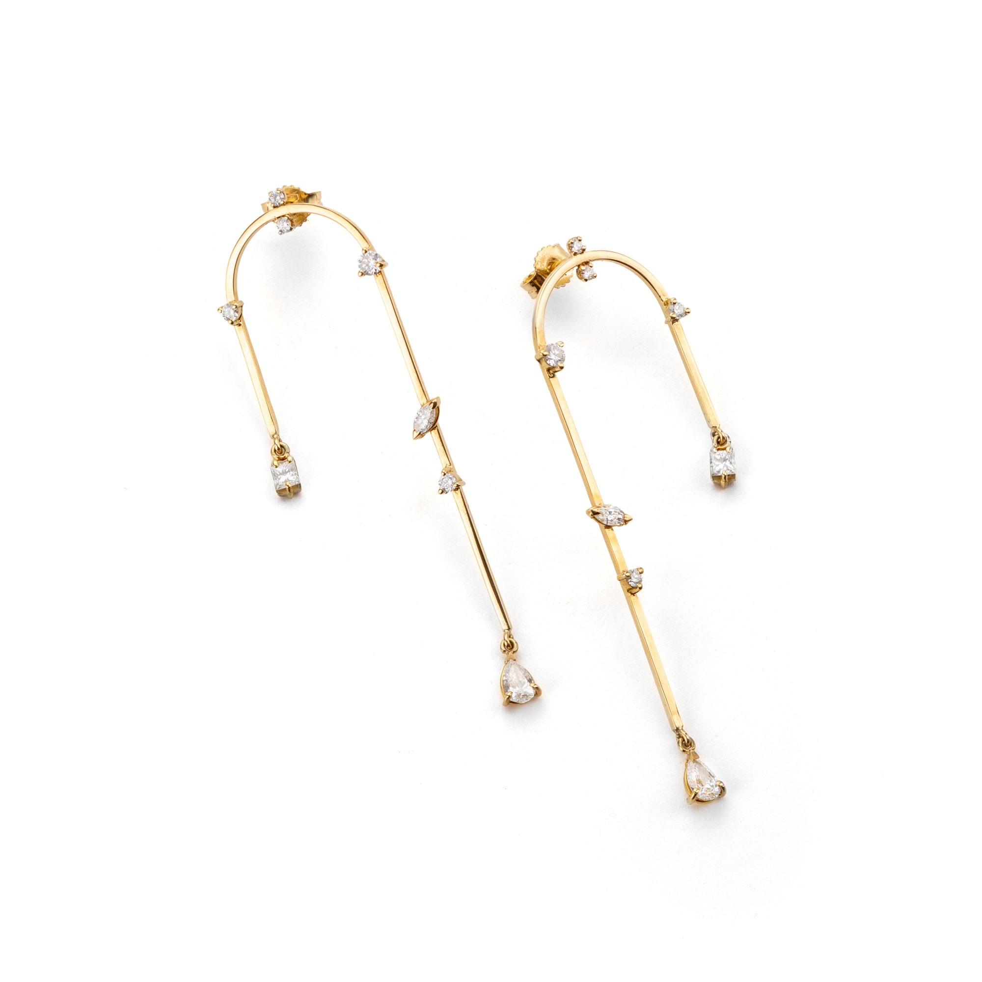 This pair of curved hook earrings is crafted in 18kt yellow gold and set with 1.26 ct white diamonds. The marquise, princess, pear, and brilliant-cut diamonds give these earrings a modern yet feminine look. The style is delicate yet precious, embodying a new form of minimalist opulence.