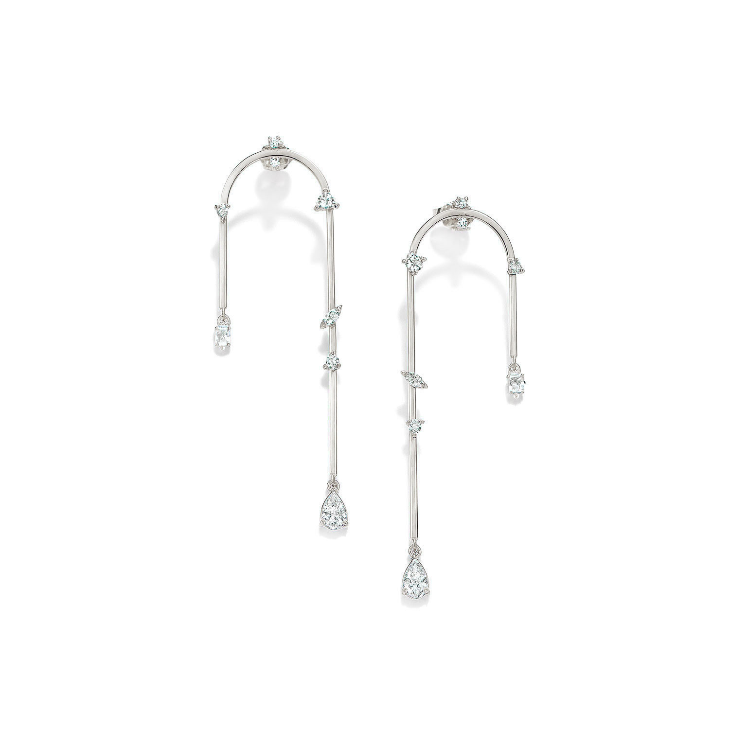 La coppia di orecchini ad amo curvo è realizzata in oro biancoo 18kt e diamanti bianchi da 1,26 ct. I diamanti di taglio marquise, princess, goccia e brillante, rendono questi orecchini moderni e femminili allo stesso tempo. Lo stile è delicato ma prezioso ed incarna una nuova forma di opulenza minimalista.