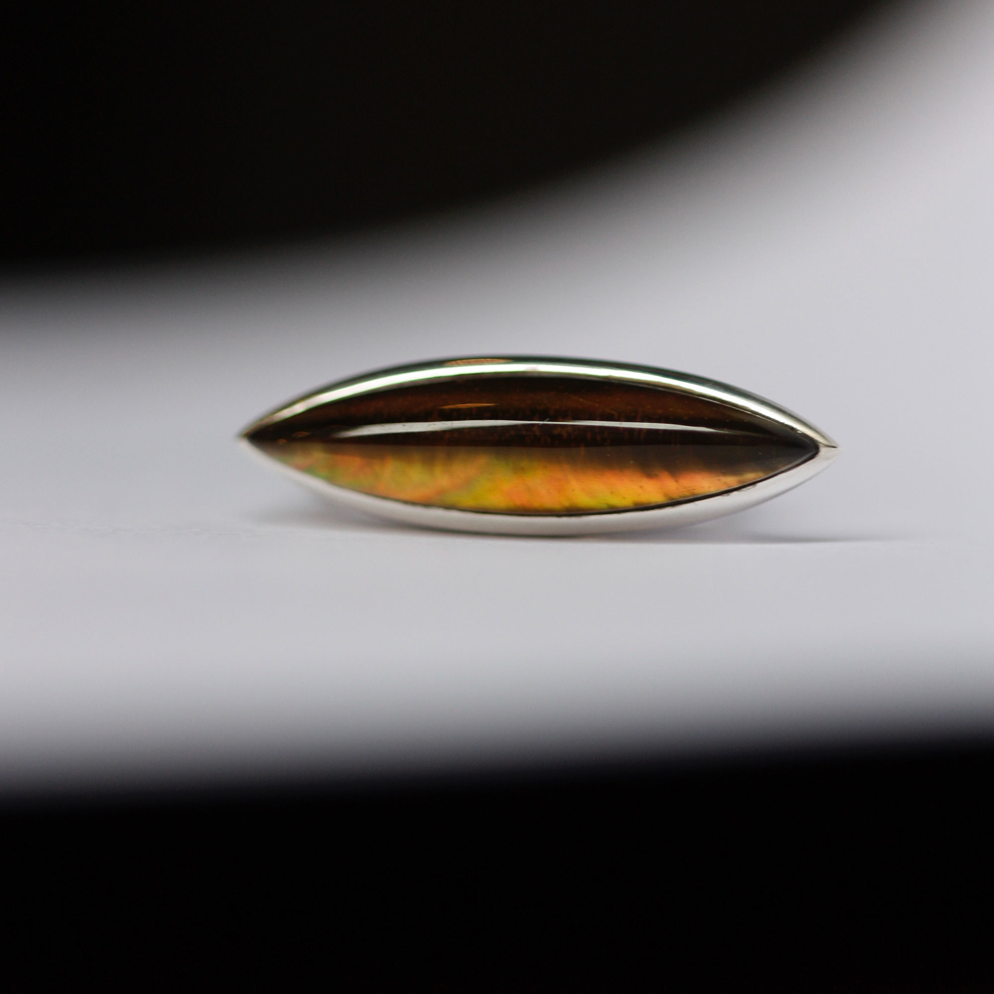 L' anello navetta della collezione 'Gocce di Aurum' è realizzato in argento 925 ed è impreziosito da una mandorla 'doppiata': la madreperla tagliata sottile, viene posizionata sotto il cristallo di rocca idrotermale color cognac, creando così un affascinante gioco di luce ed un effetto ingrandimento. Ciò che caratterizza questo oggetto iconico della nuova linea è la sua forma allungata e aereodinamica che lo rende scultoreo ma leggero allo stesso tempo.